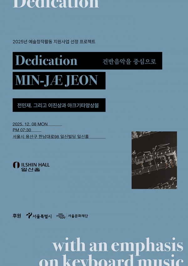 Dedication은 작곡가 전민재의 음악 세계를 중심으로 펼쳐지는 무대로, 그의 즉흥성과 작곡적 개성이 직접 드러나는 공연이다. 퀸엘리자베스 작곡 국제 콩쿠르에서 최연소 우승 이후 주목을 받은 전민재는 자신만의 어법으로 많은 피아노 작품을 써왔고, 그 작품들 대부분을 직접 연주하며 작곡가가 스스로 자신의 언어를 해석하는 전통을 이어왔다. 이번 공연 또한 전민재의 포르테피아노 연주를 중심으로 구성되며, 건반악기를 매개로 한 그의 창작적 사고가 생생한 형태로 구현된다. 첫 번째 작품인 모차르트의 ‘대위법 거장씨를 위한 장송행진곡’은 전민재의 즉흥연주로 자연스럽게 이어지며, 전통적 형식 위에 새로운 즉흥적 흐름을 구축하는 그의 접근 방식을 상징적으로 보여준다.